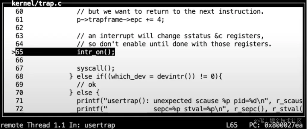 ecall后pagetable与registers的值均未发生变化,程序跳转到0x3ffffff000,也就是上面page table输出的最后一个page,这是trampoline page。我们现在正在trampoline page中执行程序,这个page包含了内核的trap处理代码。