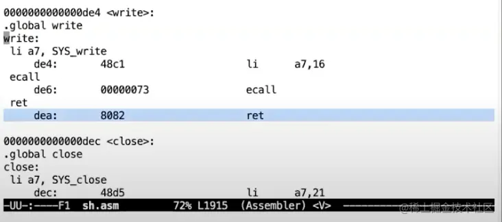 这是一个较小的指令地址,非常像是在用户内存中。如果我们查看sh.asm,可以看到这个地址是write函数的ret指令地址。