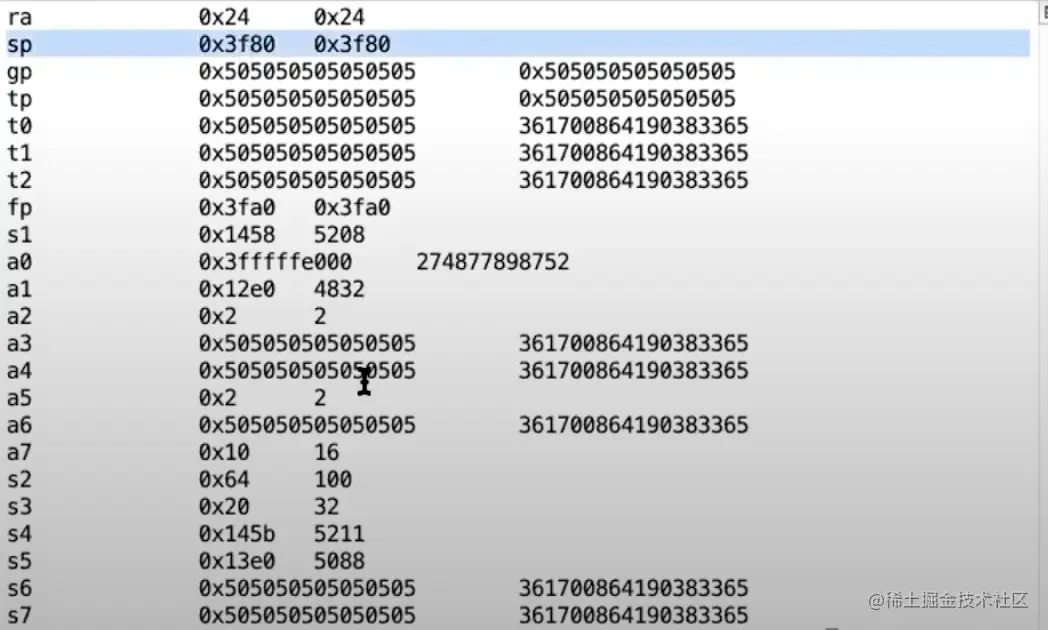 我不确定你们是否还记得,但是这些寄存器的值就是我们在最最开始看到的用户寄存器的值。例如SP寄存器保存的是user stack地址,这是一个在较小的内存地址;a1寄存器是我们传递给write的buffer指针,a2是我们传递给write函数的写入字节数。