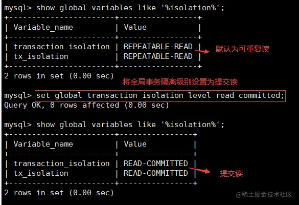 set global transaction isolation level read committed; #将全局事务隔离级别设置为提交读(RC)