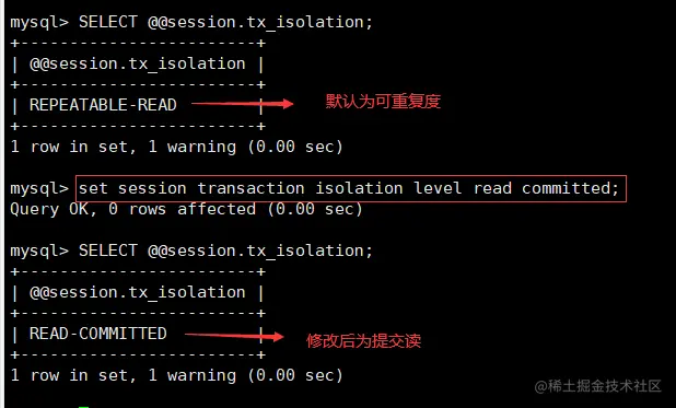 set session transaction isolation level read committed; #将会话事务隔离级别设置为提交读(RC)