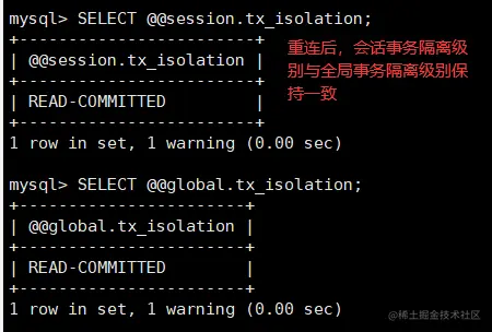 会话事务隔离级别只对当前连接有效,退出连接后失效。在其他终端连接无效。