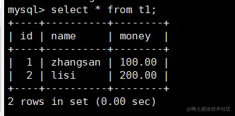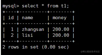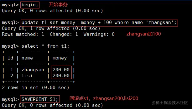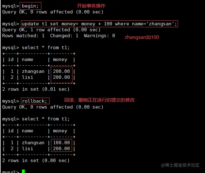 update t1 set money= money - 100 where name='zhangsan'; #zhangsan的钱减少100