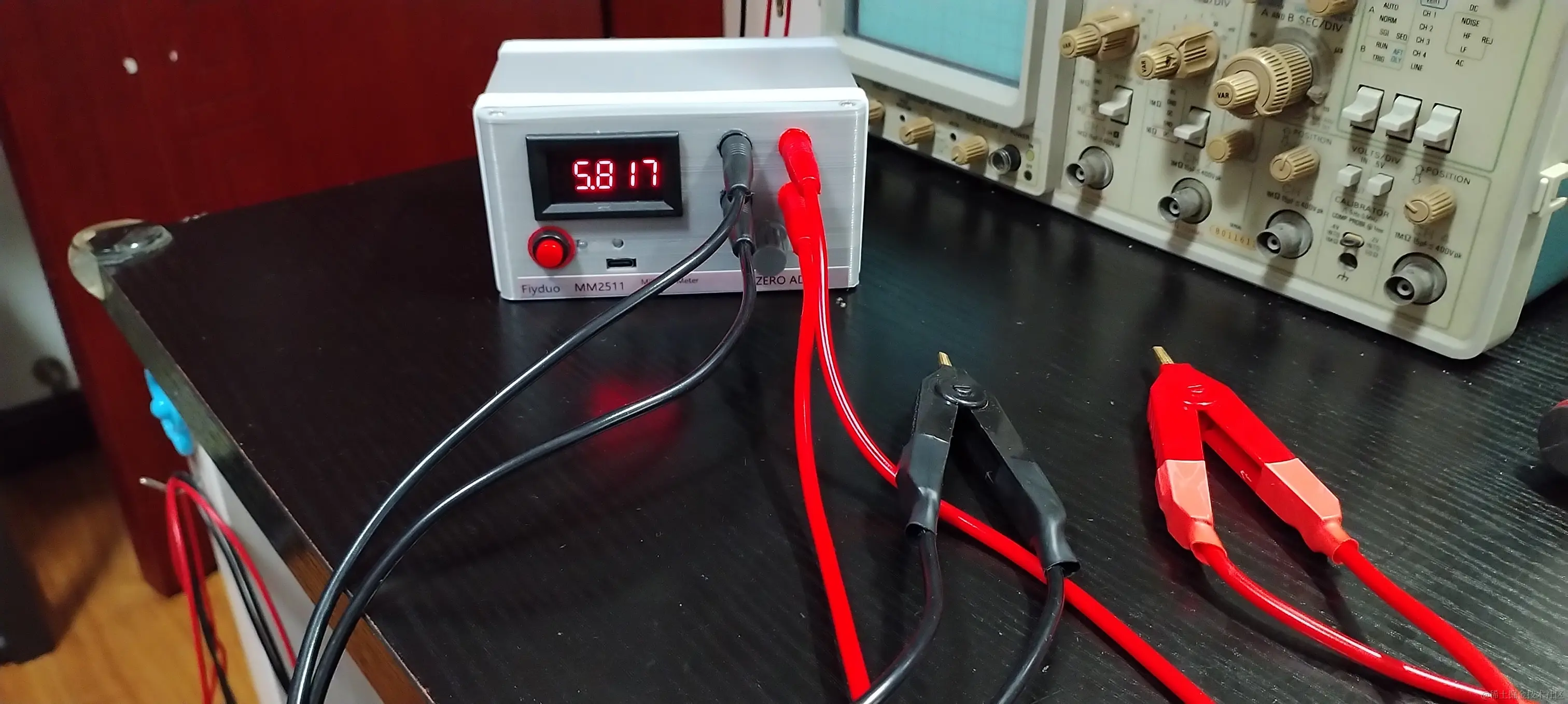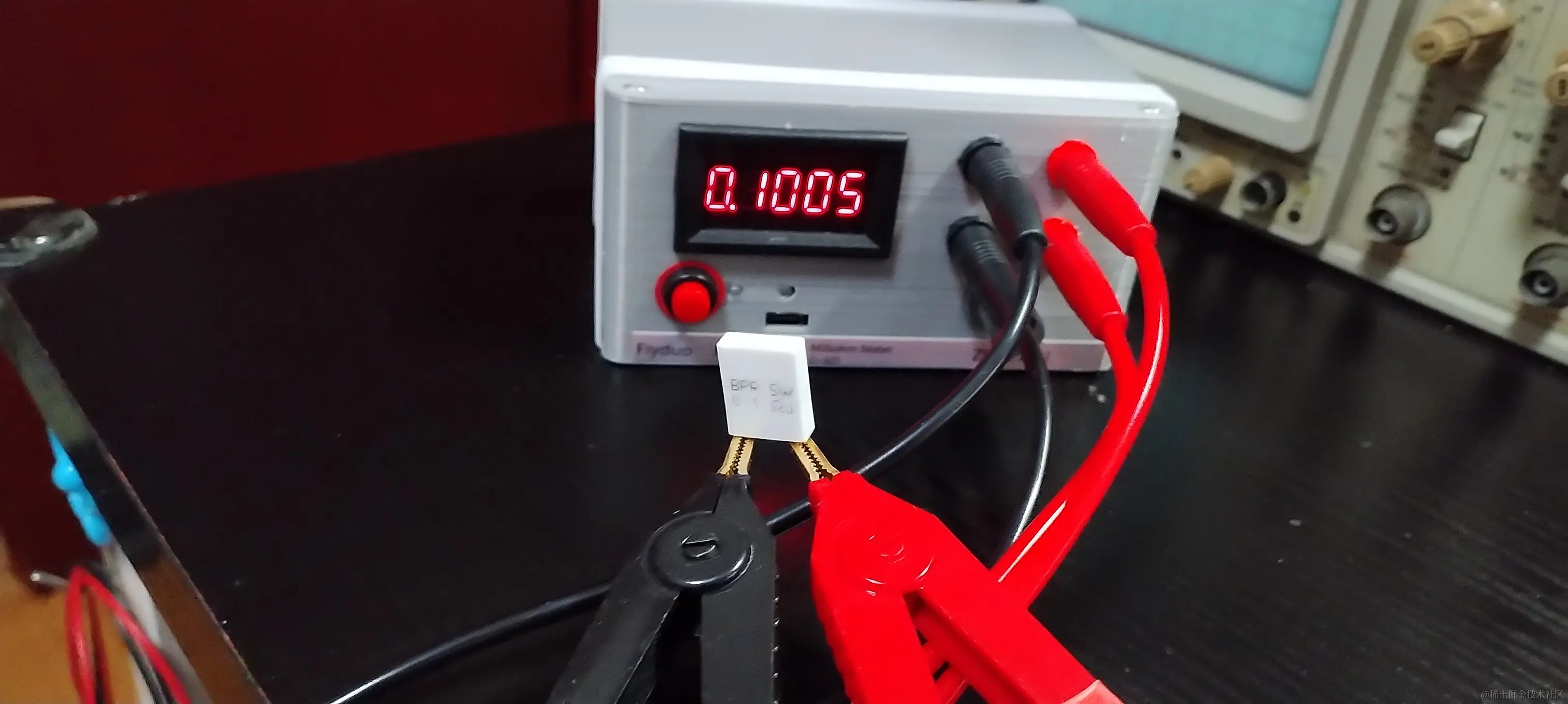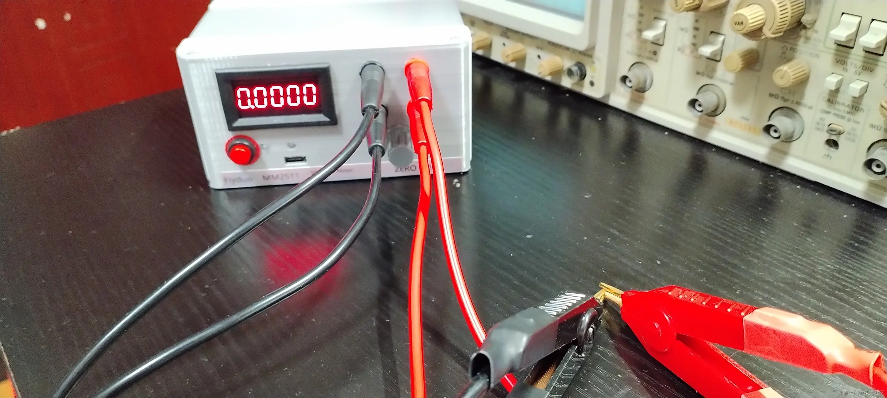 MM2511 使用说明 飞多学堂 2022-10-25 109 阅读1分钟 1. 上电 黑表笔插入黑色插孔,红表笔插入红色插孔。表显示 5.817 欧姆,无意义,正常。 2. 调零 短路红黑表笔,表显示 0 Ω,如果不是,通过调零旋钮,调零。 3. 测量 将红黑表笔街道待测电阻的两边,测量即可。单位 Ω。如图中所示电阻为 0.1005 Ω,或者 100.5m Ω。 一定要让表笔夹子和待测电阻充分接触,夹子要牢靠、紧密的夹住待测电阻, 否则读数可能会来回跳动。 夹子夹到电阻上后,至少等待10秒钟以上以让读数稳定。