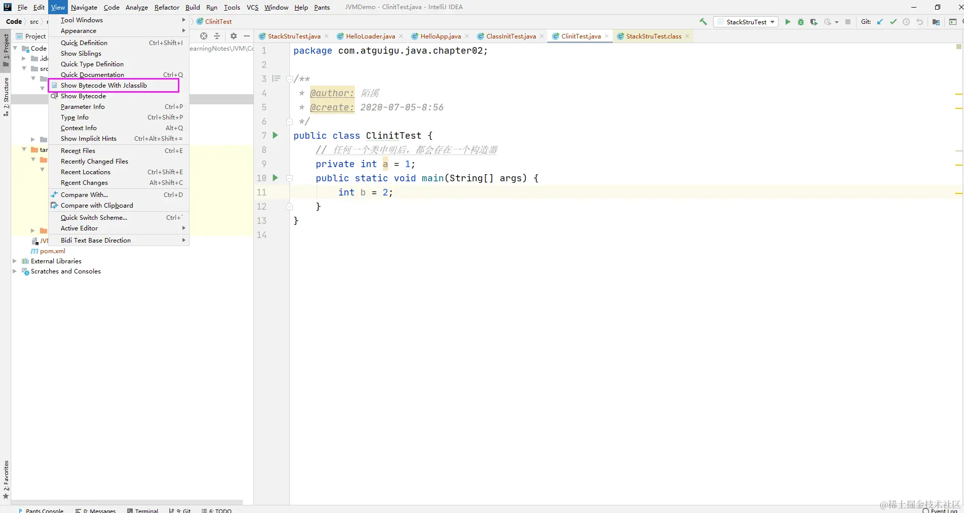 安装完成后,我们编译完一个class文件后,点击view即可显示我们安装的插件来查看字节码方法了