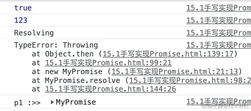 console.log(p1 instanceof MyPromise) // true, 这是一个Promise对象