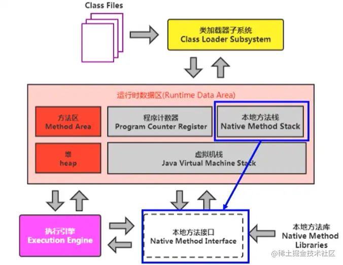 - 它的具体做法是Native Method Stack中登记native方法,在Execution Engine 执行时加载本地方法库。