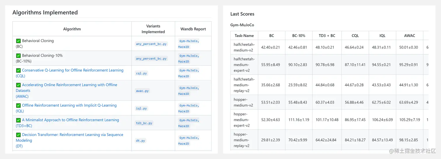 CORL 是一个离线强化学习库,为 SOTA ORL 算法提供了高质量和易于理解的单文件实现。每个实现都有一个便于研究的代码库支持,能运行或调整成千上万的实验。