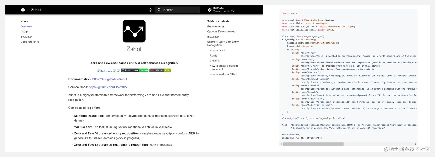Zshot 是一个高度可定制的框架,用于零样本和少样本的命名实体识别。可以在指代抽取、将文本指代与维基百科中的实体联系起来等场景发挥作用。