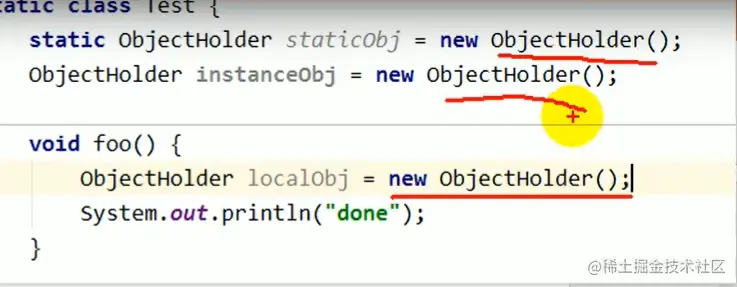 staticObj随着Test的类型信息存放在方法区,instanceObj随着Test的对象实例存放在Java堆,localobject则是存放在foo()方法栈帧的局部变量表中。