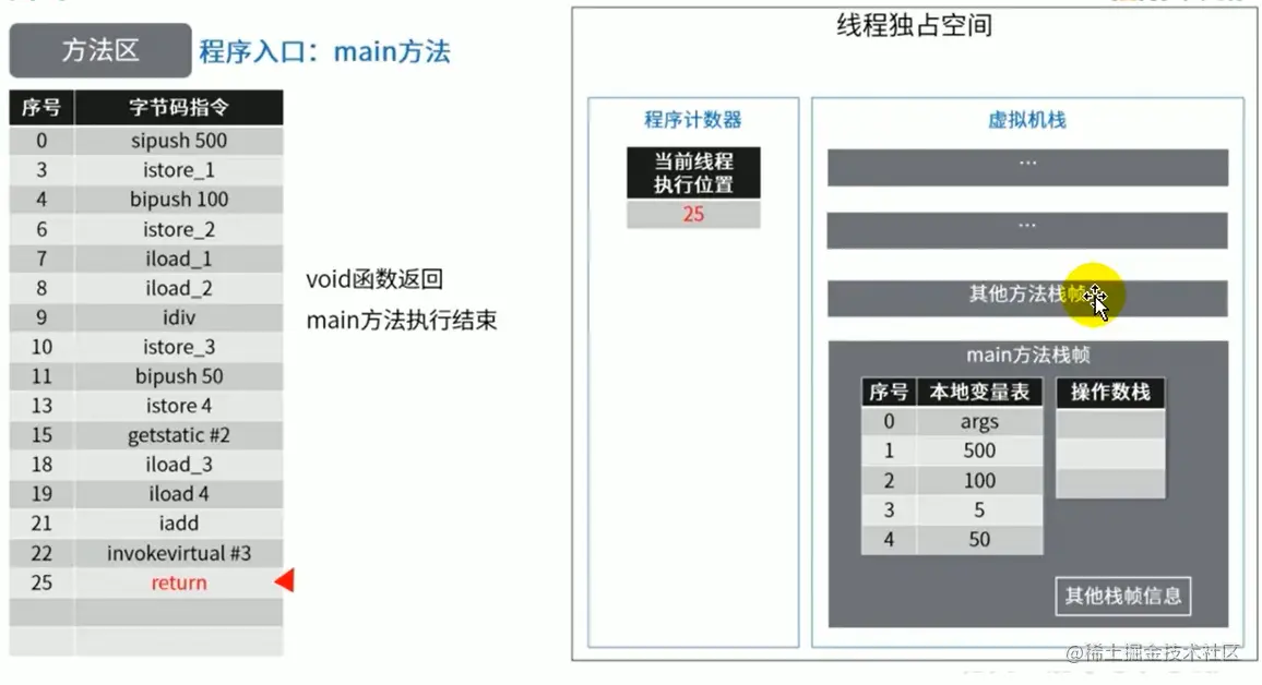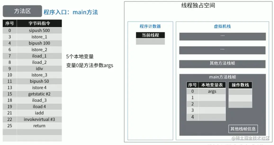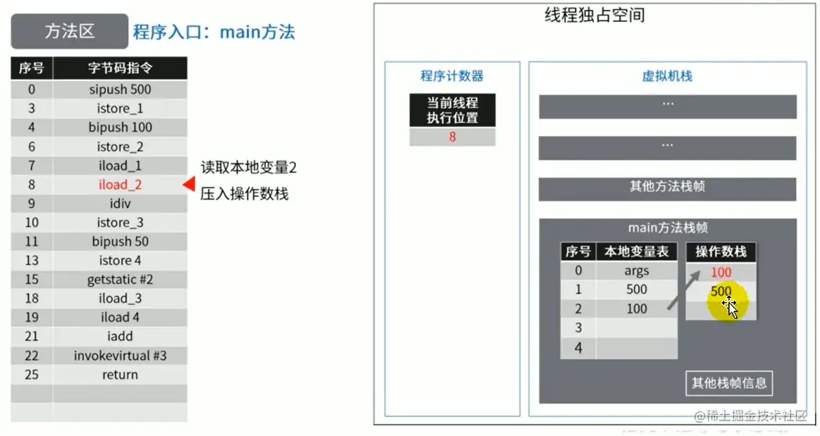 然后重复一次,把100放入局部变量表中,最后再将变量表中的500 和 100 取出,进行操作