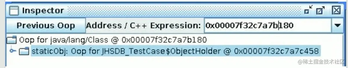 接着,找到了一个引用该staticobj对象的地方,是在一个java.lang.Class的实例里,并且给出了这个实例的地址,通过Inspector查看该对象实例,可以清楚看到这确实是一个java.lang.Class类型的对象实例,里面有一个名为staticobj的实例字段: