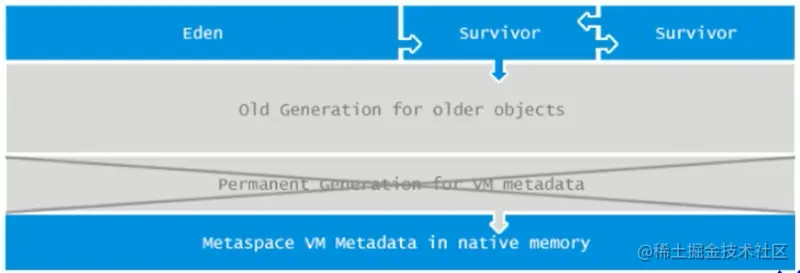 - 而到了JDK8,终于完全废弃了永久代的概念,改用与JRockit、J9一样在本地内存中实现的元空间(Metaspace)来代替