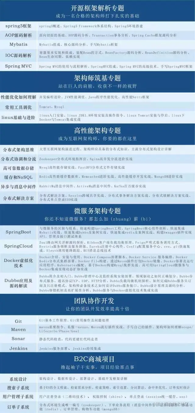 在这里分享6个专题来提高大家的编程能力:开源框架解析+架构师筑基+高性能架构+微服务架构+团队协作开发+B2C商城实战