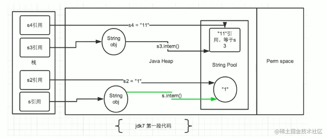 s.intern(); // 将该对象放入到常量池。但是调用此方法没有太多的区别,因为字符串常量池中已经存在了"1",跟jdk版本无关
