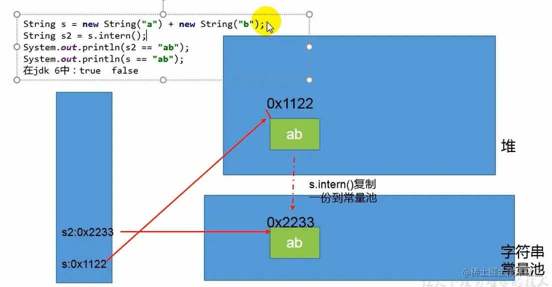 - 在JDK6中,在字符串常量池中创建一个字符串 “ab”.