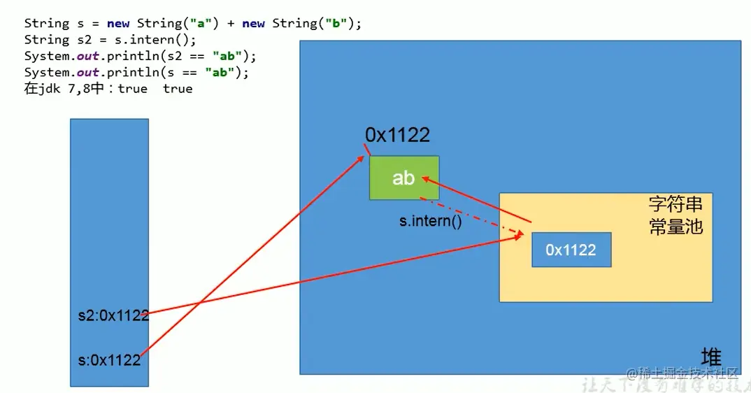 - 在JDK8中,在字符串常量池中没有创建 “ab”,而是将堆中的地址复制到 串池中。