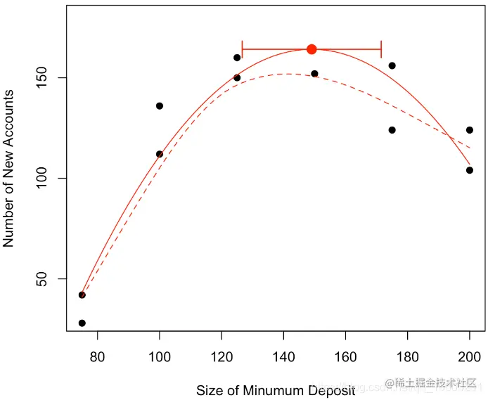 现在我们可以证明,对于形式为y =β2x2 +β1x +β0的抛物线,最优值以x⋆=θ= −β1 /2β2来获得。那么θ的自然估计量就是θ= −β 1 /2β2,通过最小化误差平方和。但是如何获得该估计量的方差?通过考虑以下因素,我们自然可以尝试Delta方法