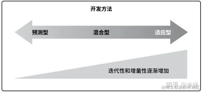 开发方法各不相同;不同的行业可能会使用不同的术语来指代各种开发方法。三种常用方法是预测型方法、混合型方法和适应型方法。如图所示,这些方法通常被视为一个频谱,从频谱一端的“预测型方法”到另一端的“适应型方法”逐渐变化。