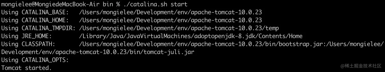 tomcat目录下的bin目录,里面存放着一些.bat和.sh后缀的文件,bat是windows系统的批处理文件,而sh则是在Unix系统中可以执行的shell命令(这里以执行sh文件演示)。将工作目录切换到服务器的bin下,输入./startup.sh后回车可以看到有输出Tomcat started即为成功。(想在任意目录下都可执行,只需要将bin目录添加到path中)实际上,执行