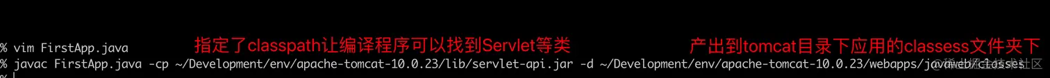 此时如果直接使用javac命令进行编译,百分百会报错,原因是我们使用了jakarta包下的类,但没有告诉javac去哪里找,所以需要使用-cp指定jar包的目录,顺便使用-d指定编译后的产出位置,根据上面说的,我们需要放置到tomcat目录下的webapps下的【项目名文件夹】/classes文件夹下,所以最终要执行的javac命令如下