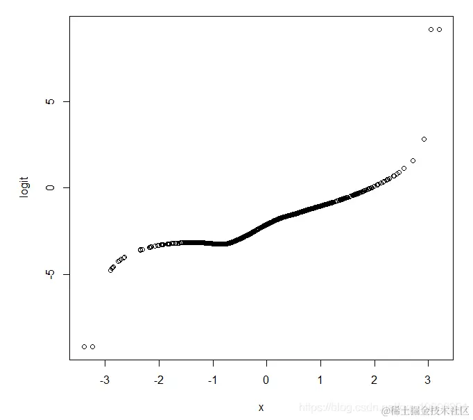 我们可以通过绘制为我们计算的估计概率(Y的平均值)的logit来克服这个问题。在Stata中,lowess命令有一个logit选项,它给出了一个平滑的logit对X的图。在R中我们可以写一个简短的函数来做同样的事情: