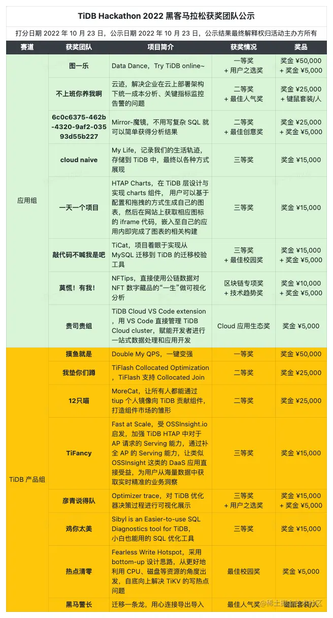 最终,经过紧张评选,评委团共评出了 TiDB 产品组和应用的一、二、三等奖和最佳创意奖、公益贡献奖、技术趋势奖、Cloud 应用生态奖、最佳人气奖、最佳校园奖、用户之选奖。由于奖项角逐太激烈,有很多优秀项目遗憾落选,以下是全部获奖名单: