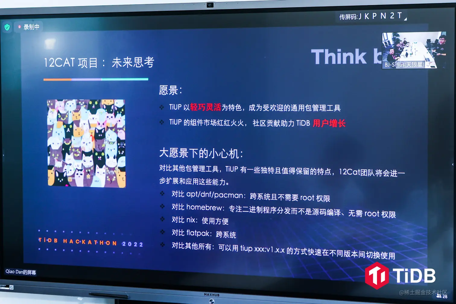 评委老师们认为本届参赛队的很多项目“很有野心”,并已经具备落地的成熟度。例如「图一乐」 队通过 “Data Dance” 提供了一个允许你探索、分析、理解数据的在线服务;「12 只喵」队伍让所有人都能通过 TiUP 个人镜像向 TiDB 贡献组件,打造组件市场的雏形;「我垫你们蹲」队通过引入新的索引来实现 TiDB 的协同优化能力的“TiFlash Collocated Optimization”;「cdc-plg」队为 TiCDC 用户提供可扩展插件的“cdc sink plugin”项目;「Canopus」队的“TiDB 计算微服务”项目等等……还有太多项目就不一一列举了,大家可以通过以下链接了解全部项目。