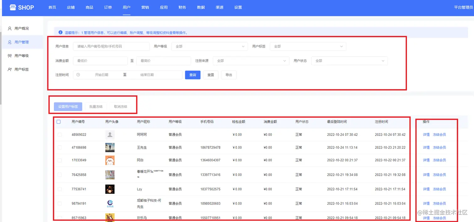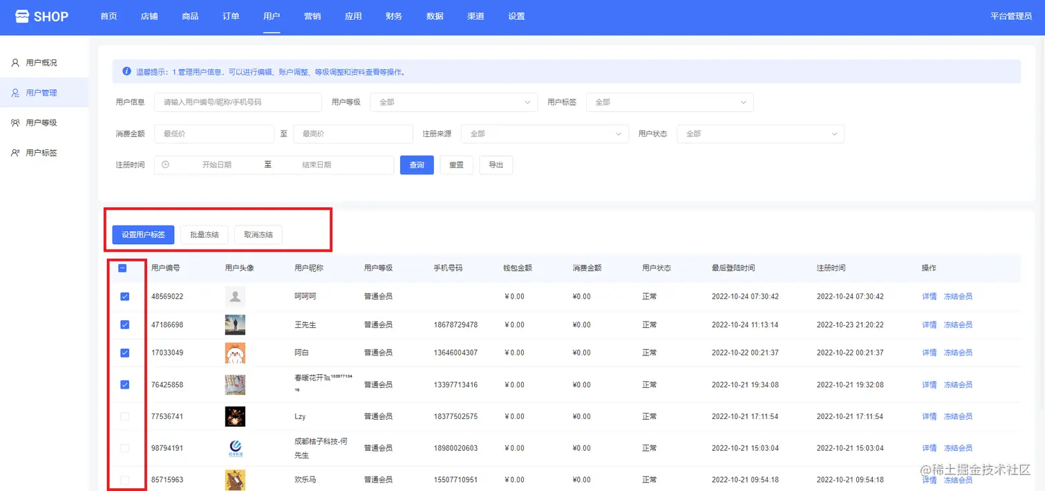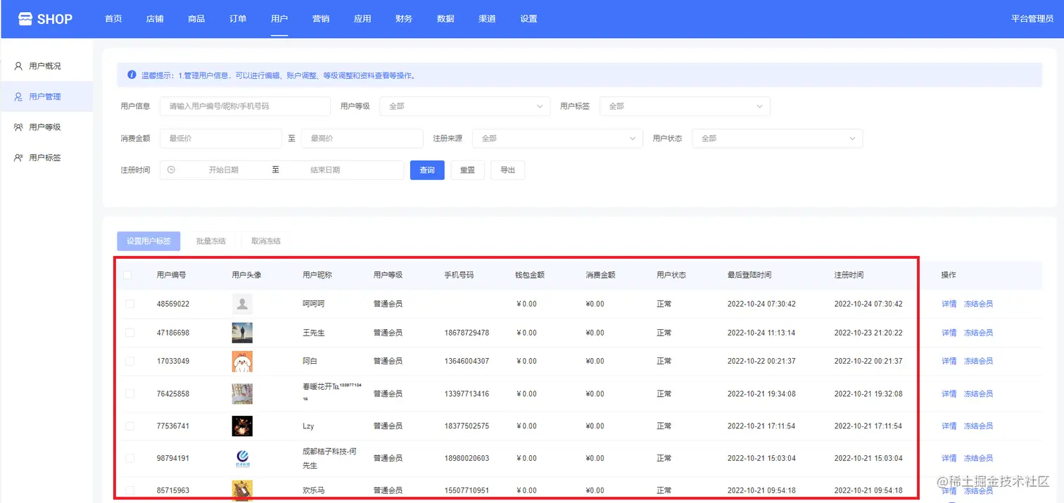 下面可以看到用户编号、用户头像、用户昵称、用户等级、手机号码、钱包金额、消费金额、用户状态、最后登录时间、注册时间等,如下图所示: