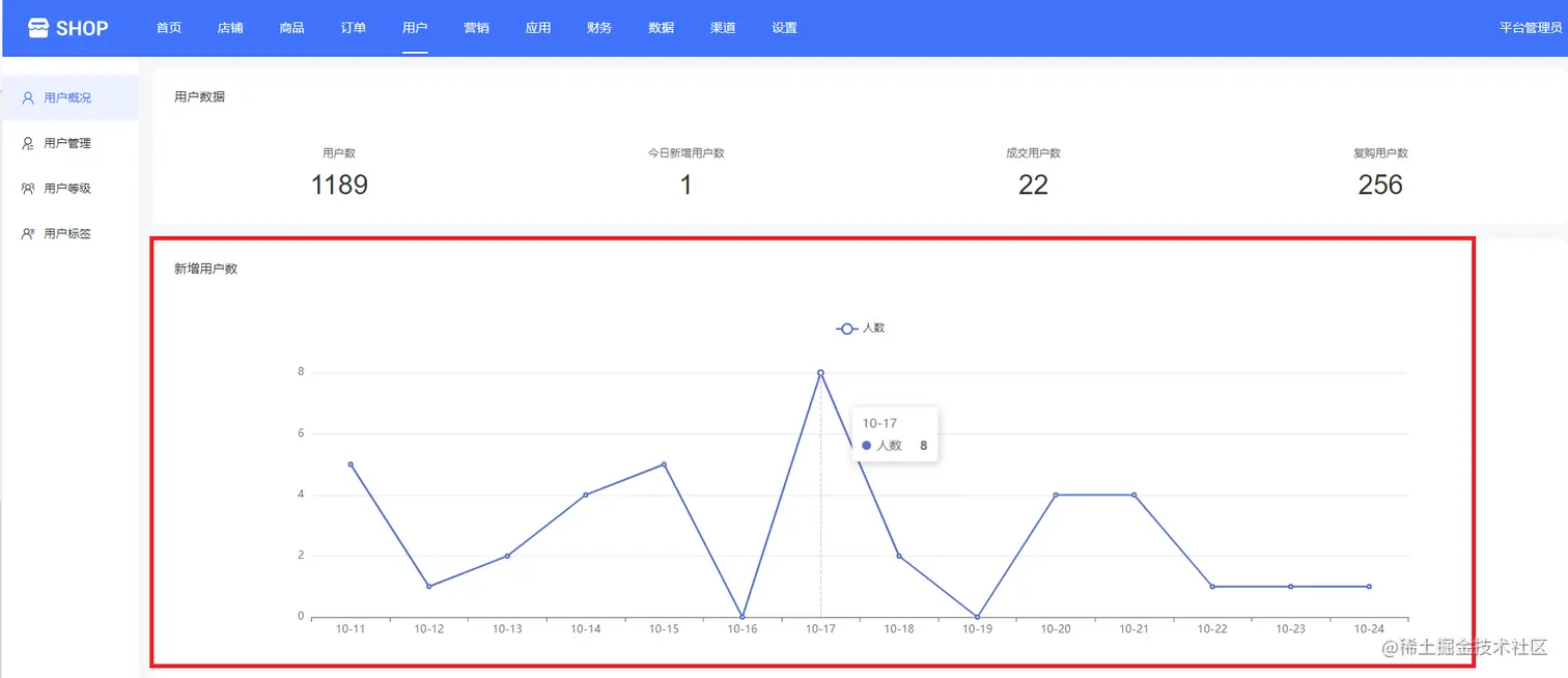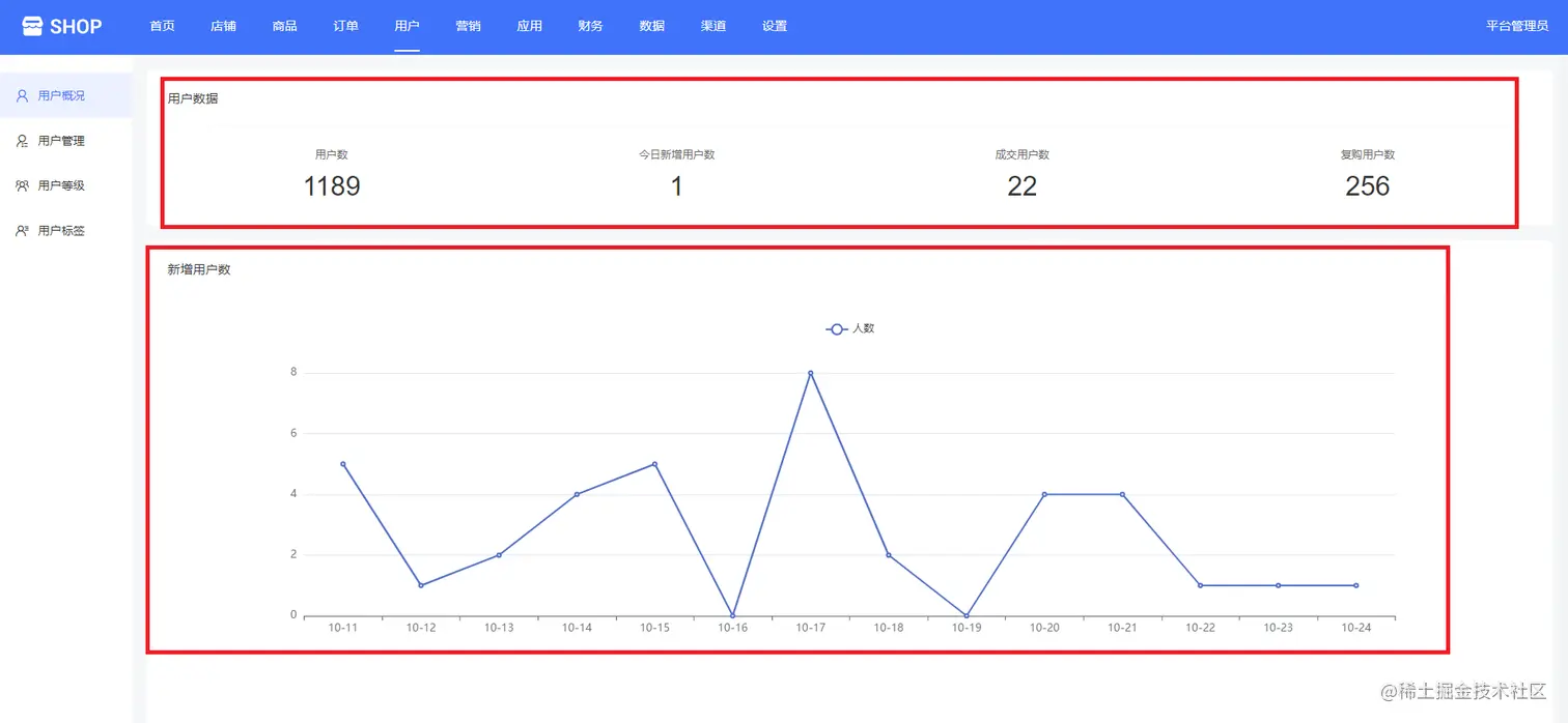 用户概况可以统计用户总数、今日新增用户数、成交用户数、复购用户数等用户数据,方便平台管理查看,如下图所示: