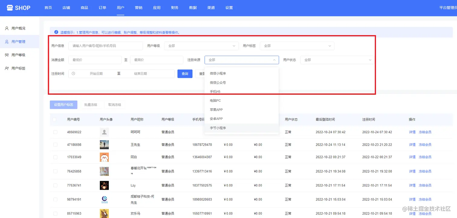 平台管理可以通过输入用户信息(用户编号/昵称/手机号码)、用户等级(普通会员、黄金会员、白金会员、紫金会员)、用户标签、消费金额、注册来源(微信小程序、微信公众号、手机H5、电脑PC、苹果App、安卓App、字节小程序)、用户状态(冻结、正常)、注册时间等,搜索查询用户,如下图所示: