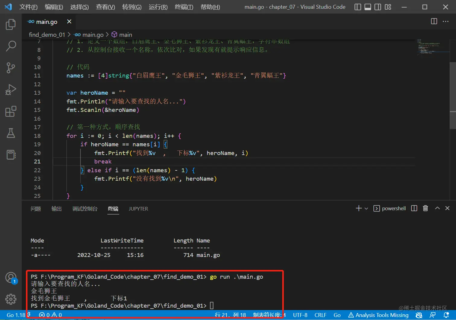 fmt.Printf("找到%v , 下标%v", heroName, index)