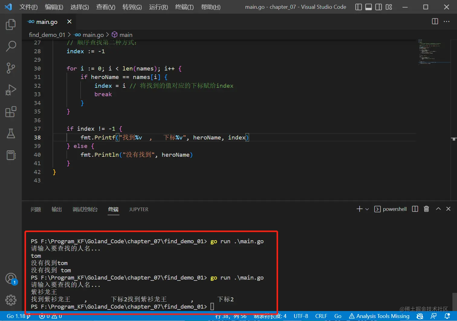 fmt.Printf("找到%v , 下标%v", heroName, i)