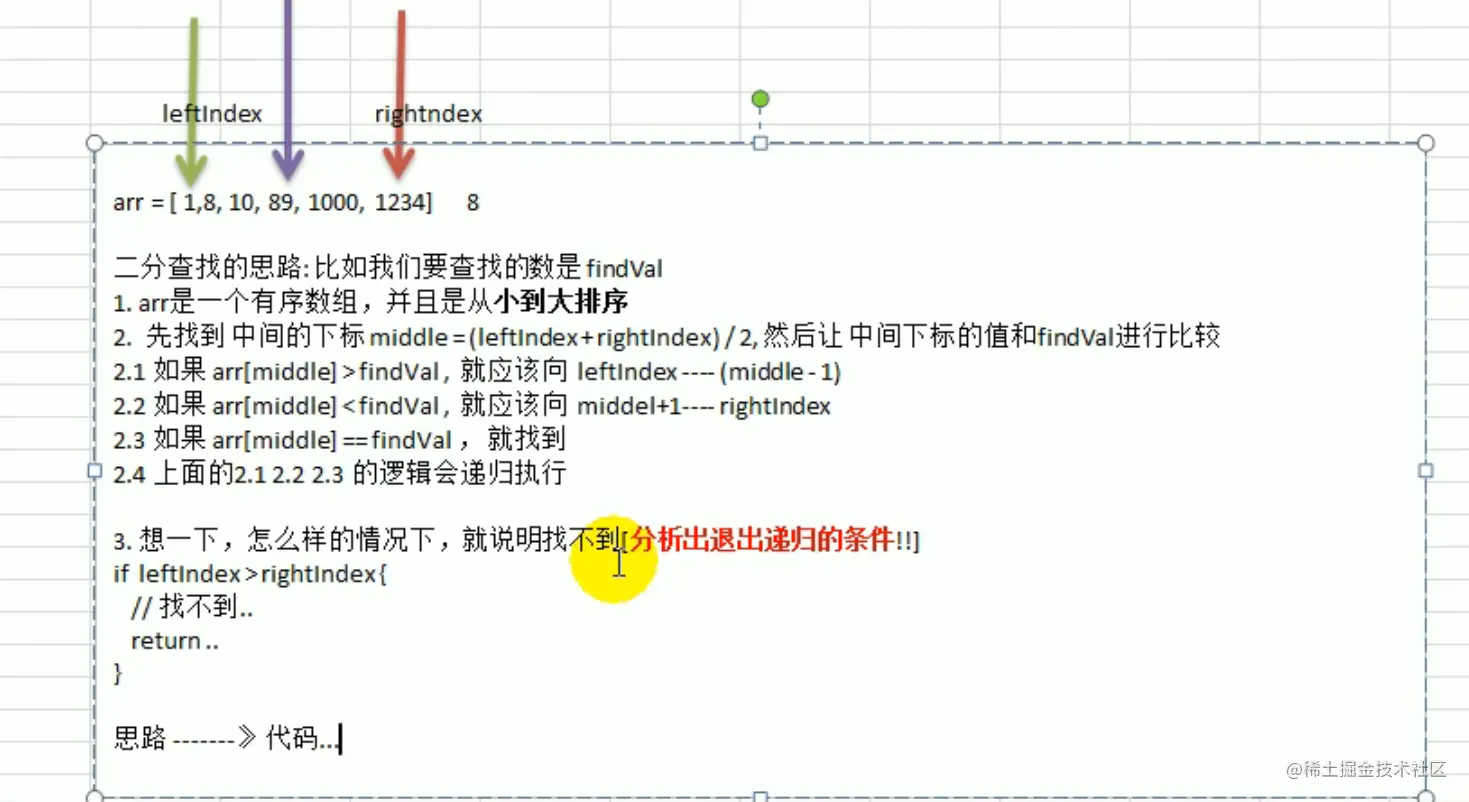 middle = (leftindex + rightindex) /2,然后让中间下标的值和 findVal 进行比较