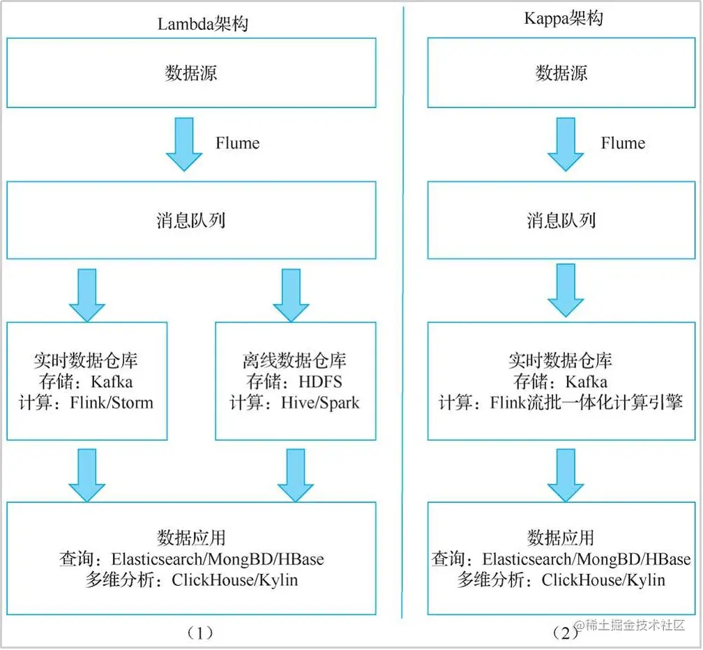 最直观的想法是分别为离线计算和实时计算场景搭建计算平台,让两套平台共存。这就是常说的Lambda架构的处理方式,如下图(1)所示。