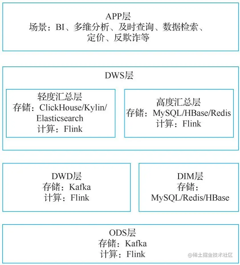 实时数据仓库与离线数据仓库最大的区别是通过使用消息队列、流批一体化计算引擎、查询引擎等工具让整个平台的计算和查询效率更高,以满足业务的实时需求。因此,实时数据仓库对计算能力要求更高。如果数据量短期陡然增加,那么要考虑实时数据仓库的性能和稳定性问题。相比之下,离线数据仓库对数据量的增加不太敏感,性能更加稳定。另外,从分层建模的角度来看,实时数据仓库的层级不宜太多,否则会增加响应的延时。下图是基于流批一体化计算引擎 Flink 的实时数据仓库的分层框架和技术选型。
