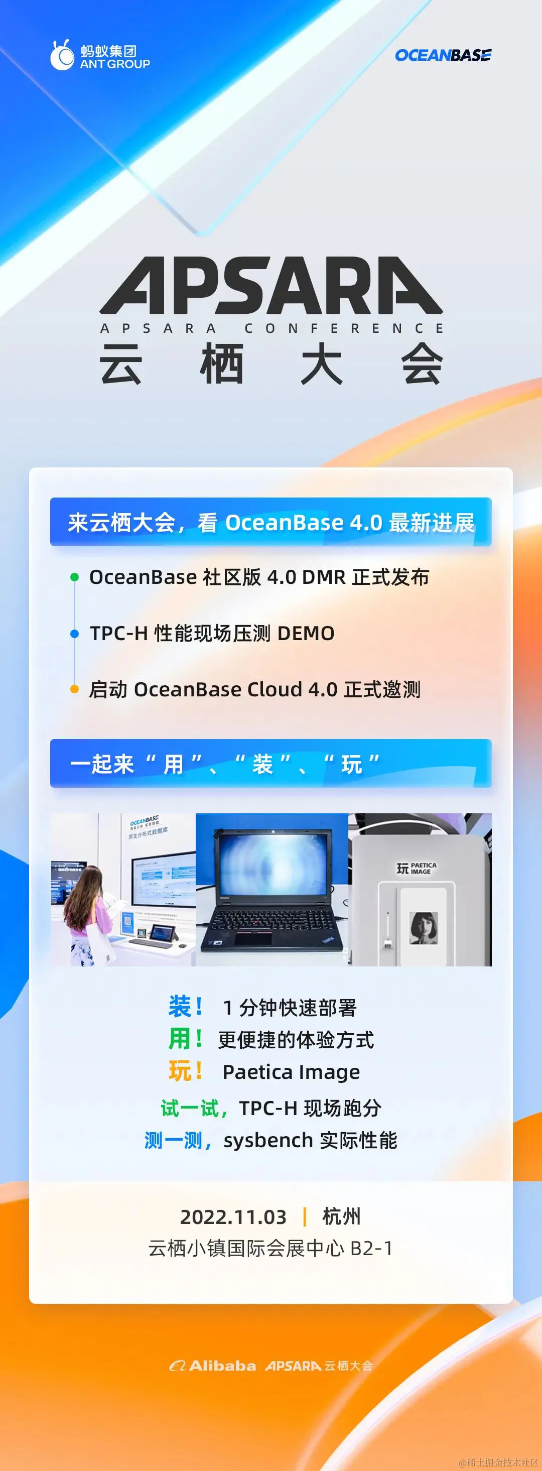 11 月 3 日,本届云栖大会将在杭州云栖小镇正式开幕,蚂蚁集团将在本届云栖大会重磅举行「追光向未来 • 蚂蚁集团数字科技峰会」,届时,OceanBase 将公布 4.0 版本的最新进展。