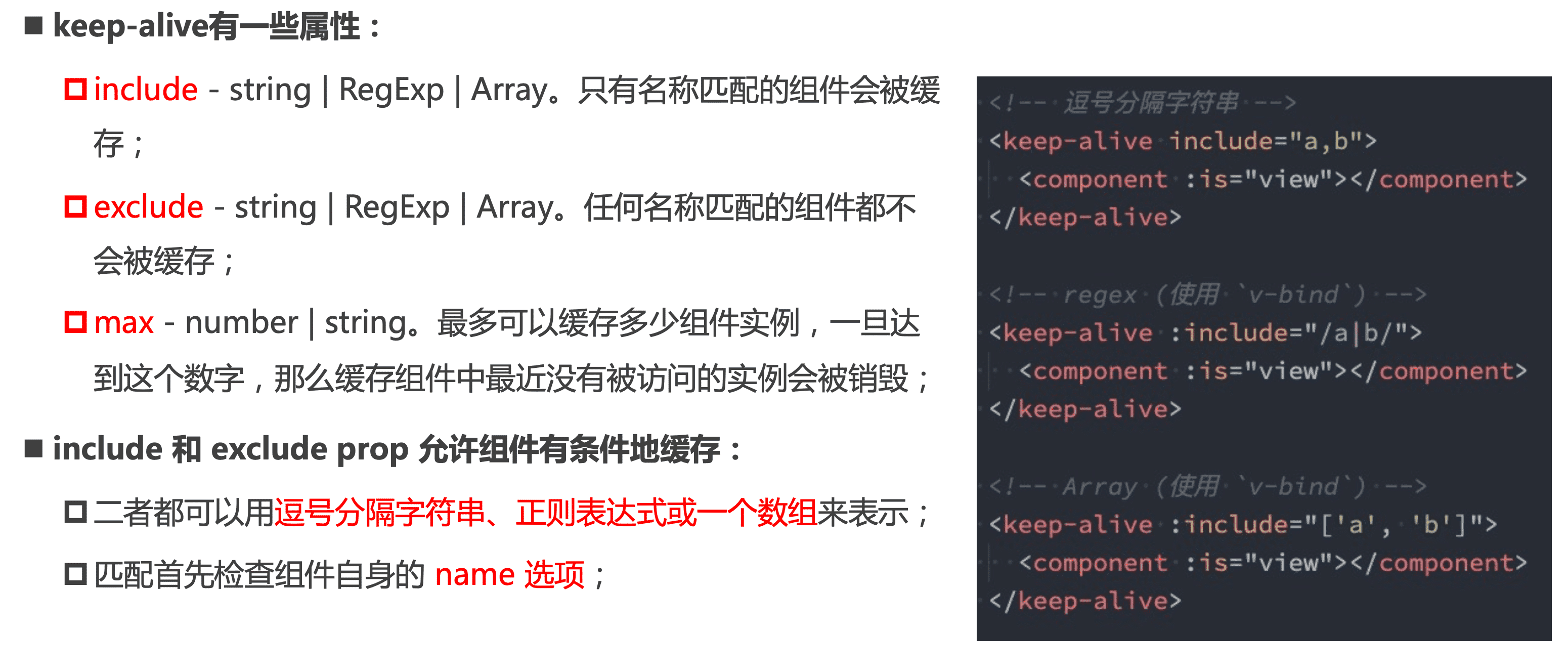 - Keep-alive的一些属性,以下代码中在上面进行示范了