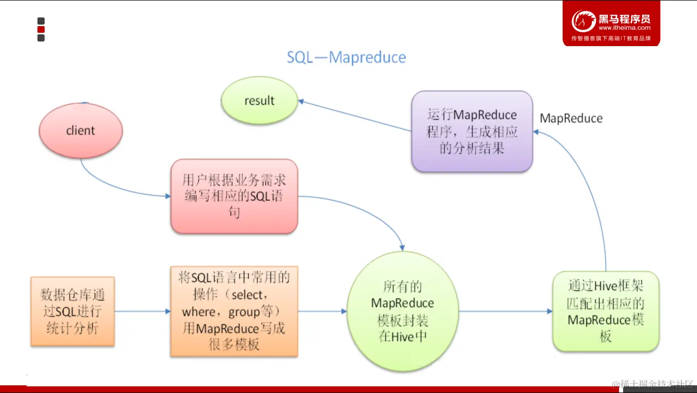 其本质是将SQL转换为MapReduce的任务进行运算,底层由HDFS来提供数据的存储,说白了hive可以理解为一个将SQL转换为MapReduce的任务的工具,甚至更进一步可以说hive就是一个MapReduce的客户端。