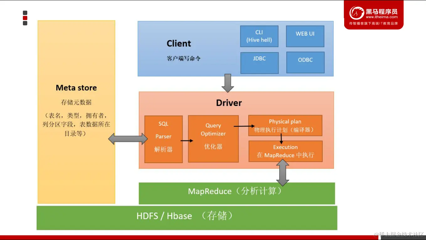 存储和执行: Hive使用HDFS进行存储,使用MapReduce进行计算