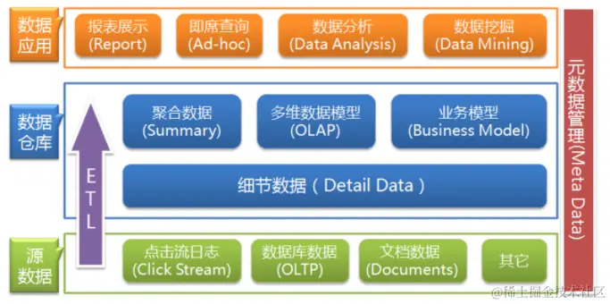数据仓库的数据来源于不同的源数据,并提供多样的数据应用,数据自下而上流入数据仓库后向上层开放应用,而数据仓库只是中间集成化数据管理的一个平台。