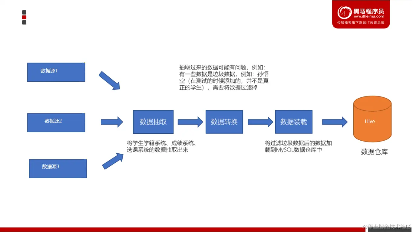 数据仓库中存储的数据是来源于多个数据源的集成,原始数据来自不同的数据源,存储方式各不相同。要整合成为最终的数据集合,需要从数据源经过一系列抽取、清洗、转换的过程。