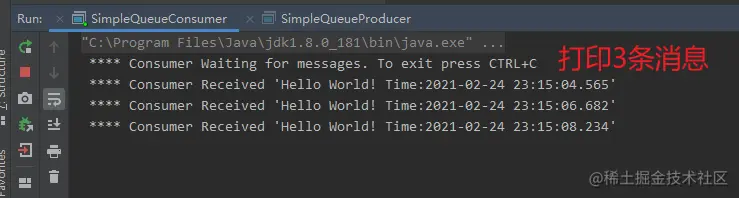 运行 Produce三次,产生3条消息,可以看下监控界面 localhost:15672 guest/guest