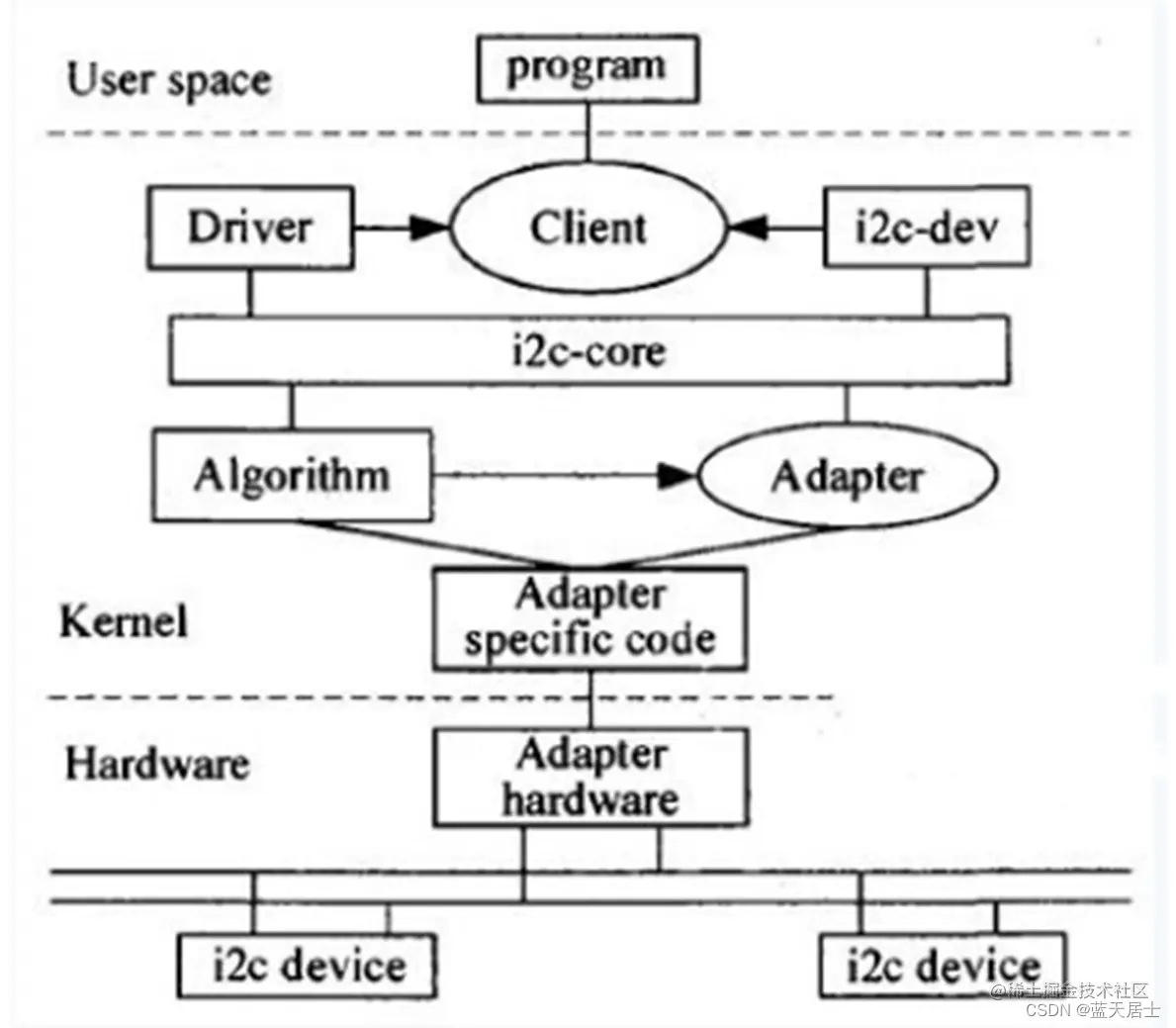 I2C总线驱动是对I2C硬件体系结构中适配器端的实现,适配器可由CPU控制,甚至可以直接集成在CPU内部。