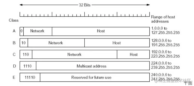 早期采用分类的IP地址,将IP地址分成了A、B、C、D、E五类: