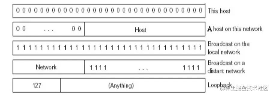 - 32位全为 1 表示整个TCP/IP网络的广播地址。但由于路由器会隔离广播域,实际上还是本网络内部的广播地址。