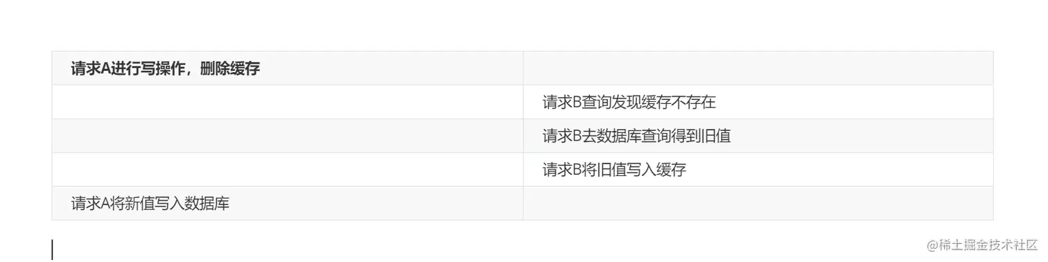 - B线程查询数据,此时还未删除缓存,缓存中还有,得到的就是旧的缓存数据【此时就出现了数据库和缓存中数据不一致的情况】