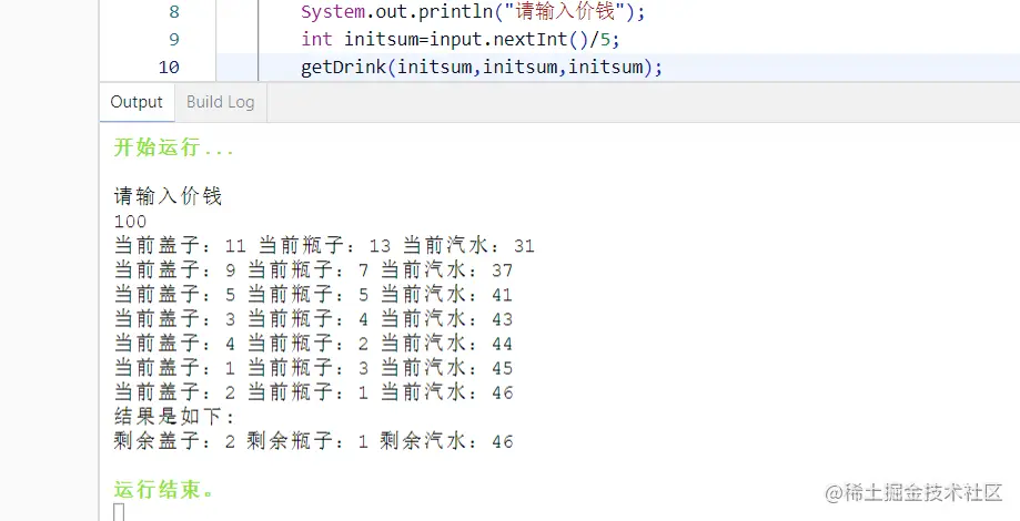 System.out.printf("结果是如下:\n剩余盖子:%d 剩余瓶子:%d 剩余汽水:%d\n",cap,bottle,drink);