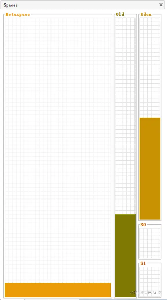 VisualGC窗口是最左的窗口,分成三条垂直柱体,在JDK1.8版本中,分别代表metaSpace元空间、Old老年代、新生代,其中新生代又划分成 Eden 区, S0 区, S1区三部分。柱体里颜色部分代表占用的空间,空白部分表示剩余空间。监控项目的堆进程时,这些代表颜色的地方都是动态变化的。