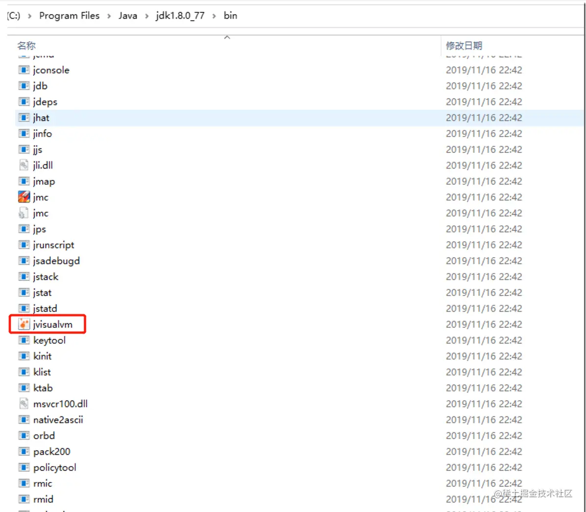 visualvm工具是JDK自带的,在java安装目录下可以找到:C:\Program Files\Java\jdk1.8.0_77\bin